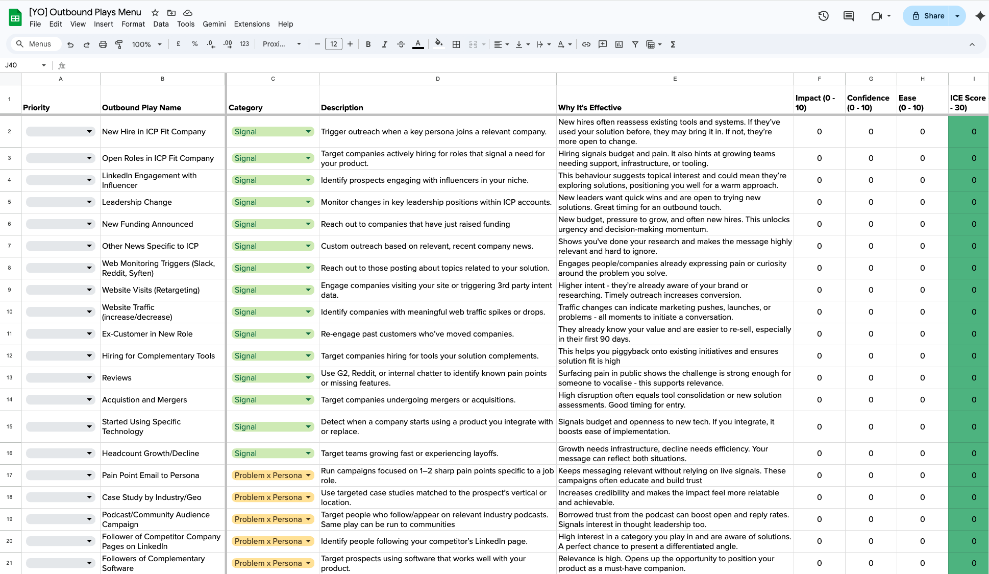 With clients, I keep a spreadsheet of outbound plays. We score each play using ICE so we can decide what to start with, what to run always-on, and what to deprioritise until later.